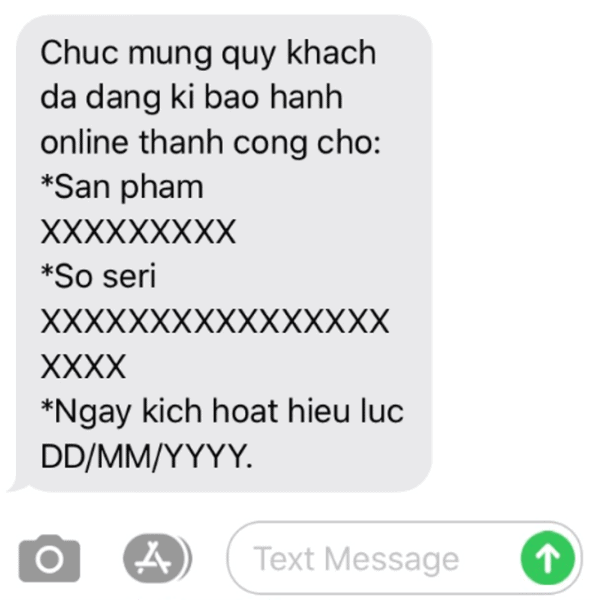 Nếu sau khi mua hàng và đã được đăng kí bảo hành nhưng quý khách vẫn chưa nhận được tin nhắn hoặc email thông báo. Liên hệ ngay tới nơi quý khách mua hàng để kiểm tra.